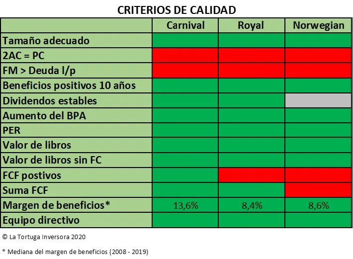 ¿Qué le han parecido los tres cruceros? Seguro que piensa que es un sector con una perspectiva negativa a corto plazo y que el coronavirus va a impactar fuertemente en la industria turística. Eso no lo dude, este año los ingresos van a descender drásticamente; lo perdido jamás se facturará. No obstante, La Tortuga Inversora invierte con una visión a largo plazo y para que se sienta más seguro que navegando en el Titanic, aplicaremos los criterios de calidad de La Tortuga Inversora.