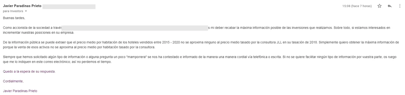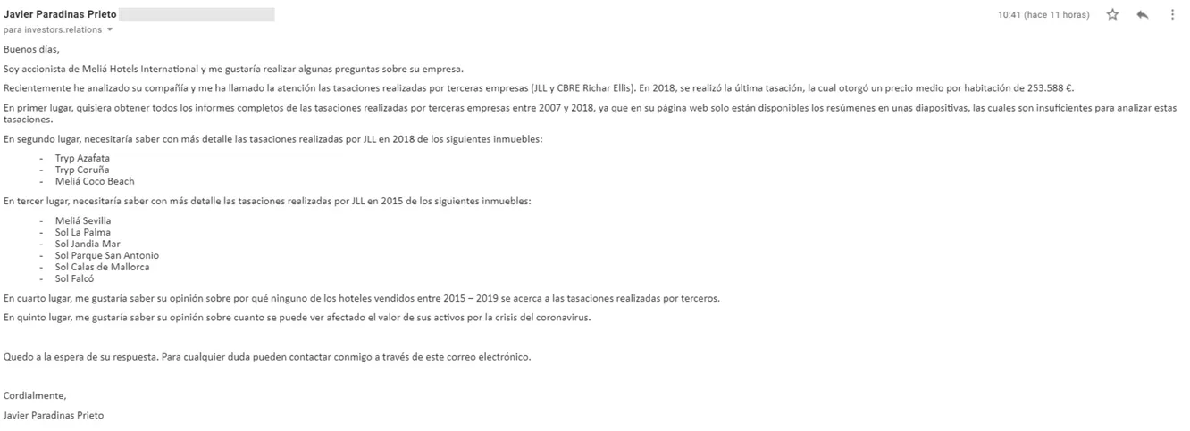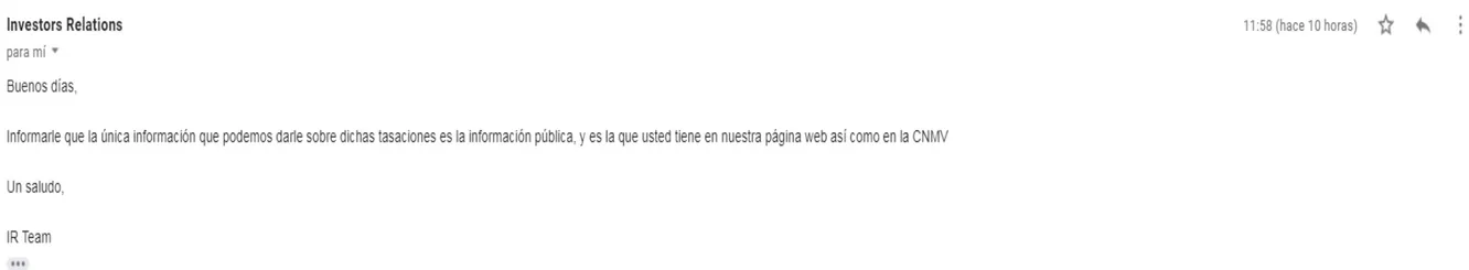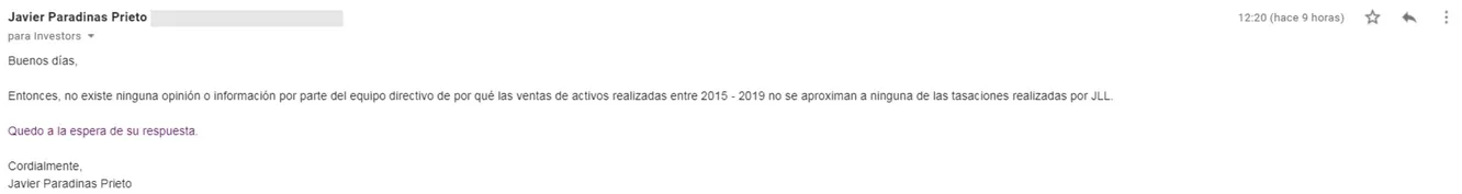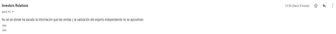 Se ha contactado con el departamento de relación con inversores de la empresa para obtener más información sobre las tasaciones realizadas por terceros. A continuación, se muestran los correos electrónicos.