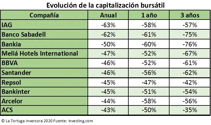 La tabla superior muestra las diez empresas del selectivo español que más han perdido desde comienzos del año. La mitad pertenecen al sector financiero, penalizado por el posible estrés de liquidez que podría aparecer en los próximos meses. En la lista también encontramos a IAG, con los aviones parados; Repsol, con la caída de los precios del crudo; Arcelor, donde China es el gran consumidor de acero mundial, y ACS, que ve como algunas obras pueden no realizarse debido al endeudamiento público. En cuanto a la empresa que atañe a este artículo, Meliá Hotels, ha visto reducir su capitalización un 47 %, situándose como la cuarta empresa que más peso pierde en el selectivo español.