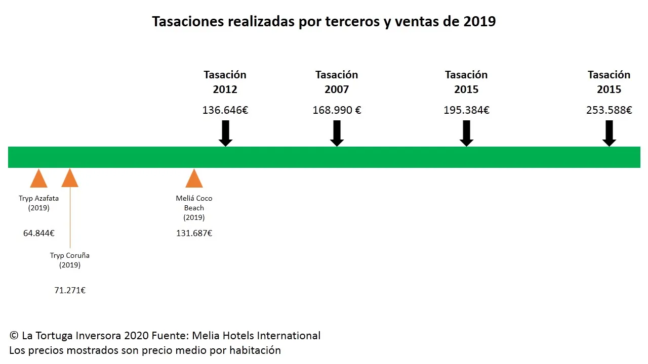 El gráfico superior muestra como ninguno de los tres hoteles vendidos en 2019 se acerca a la tasación realizada por JLL en 2019. Es más, ninguno de los hoteles vendidos entre 2015 - 2019 se acerca a alguna de las tasaciones. En ese periodo el precio medio por habitación de los hoteles vendidos no llegaba a los 60.000 € (210.2 M € obtenidos por la venta / 3.504 habitaciones vendidas). De ahí mi duda, si el precio medio por habitación tasado es de 253.588 € por qué ninguna venta está por encima o se aproxima al precio de tasación.