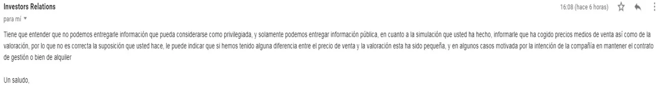 En mi experiencia personal como inversor debo decir que es la primera vez que un departamento de relación con inversores se resiste a dar algo de información sobre las preguntas realizadas. Entiendo que las tasaciones, que pagan todos los accionistas, sea información privilegiada, pero el trato debería mejorar para los inversores.