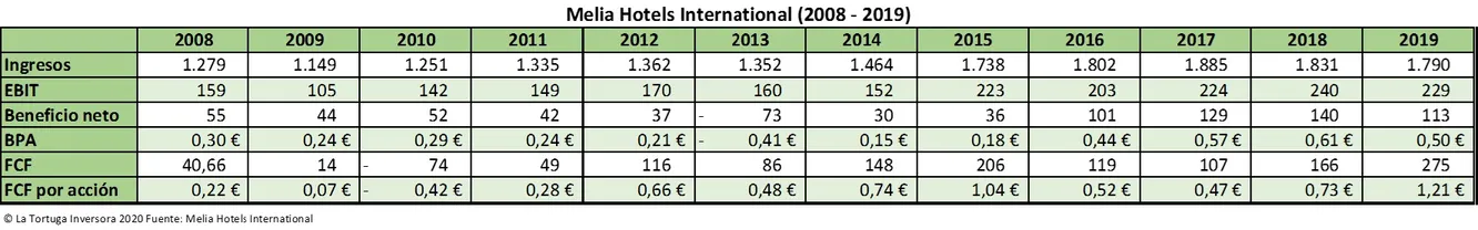 La evolución histórica de Meliá desde 2008 ha sido muy positiva. Los ingresos han crecido a una Tasa Anual Compuesta del 3,1 %, mientras que el beneficio por acción lo ha hecho al 4,8 %. El dato hubiera sido mejor si en 2016 no se hubiera ampliado capital para pagar unas obligaciones. No obstante, no se puede poner en duda la buena marcha del negocio hotelero durante los últimos doce años.