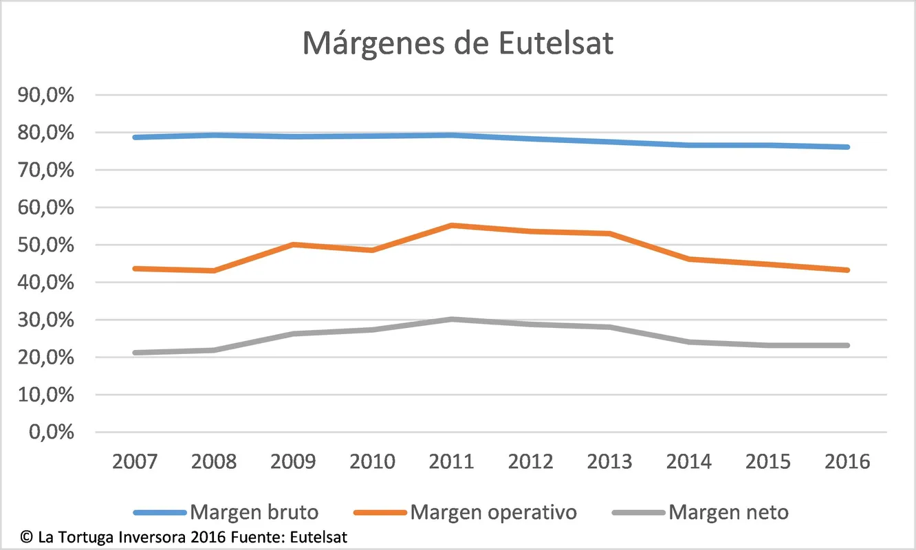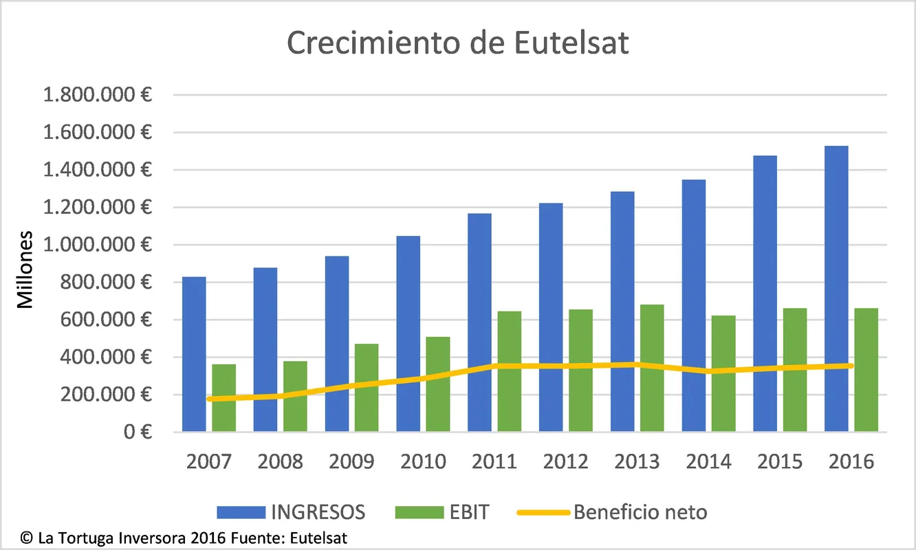 Eutelsat es una empresa francesa que opera satélites de comunicación. No se trata de una compañía muy conocida en España, aunque aquí también utilizamos sus satélites para ver la televisión por satélite (Hot Bird) y, hasta marzo de 2017, poseía el 33,6 % de la empresa española Hispasat. Con su flota de 40 satélites provee servicios a empresas de televisión y telecomunicación para transmitir información por todo el mundo. El sector al cual pertenece está creciendo a gran velocidad ya que cada vez intercambiamos más y más datos. Piensen, ¿en 2007 cuántos de ustedes tenía cobertura de datos en el móvil?