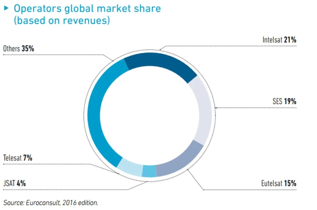 En 2016, el sector de operadores de satélites tenía 5 actores principales: Intelsat, con el 21 % del mercado, SES, con el 19 %, Eutelsat, con el 15 %, Telesat, con el 7 %, y JSAT, con el 7 %. Estamos ante un sector con poca competencia, ya que 5 empresas se reparten el 66 % del mercado mundial. Lanzar un satélite es caro y se necesita altos conocimientos de tecnología, en otras palabras, pocos pueden hacerlo. No obstante, en la actualidad el sector se enfrenta a dos amenazas: existe una sobreoferta y un servicio substitutivo, la fibra óptica.
