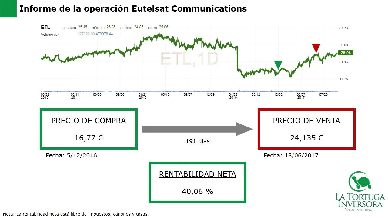 A finales de 2017, Eutelsat cotizaba en torno a los 17 € y, según el análisis, la empresa tenía un valor mínimo entre 23-25 € por acción. Esto nos daba un margen de seguridad mínimo del 30 %, suficiente para la situación de la empresa. El 5 de diciembre de 2016 se realizó la única inversión.