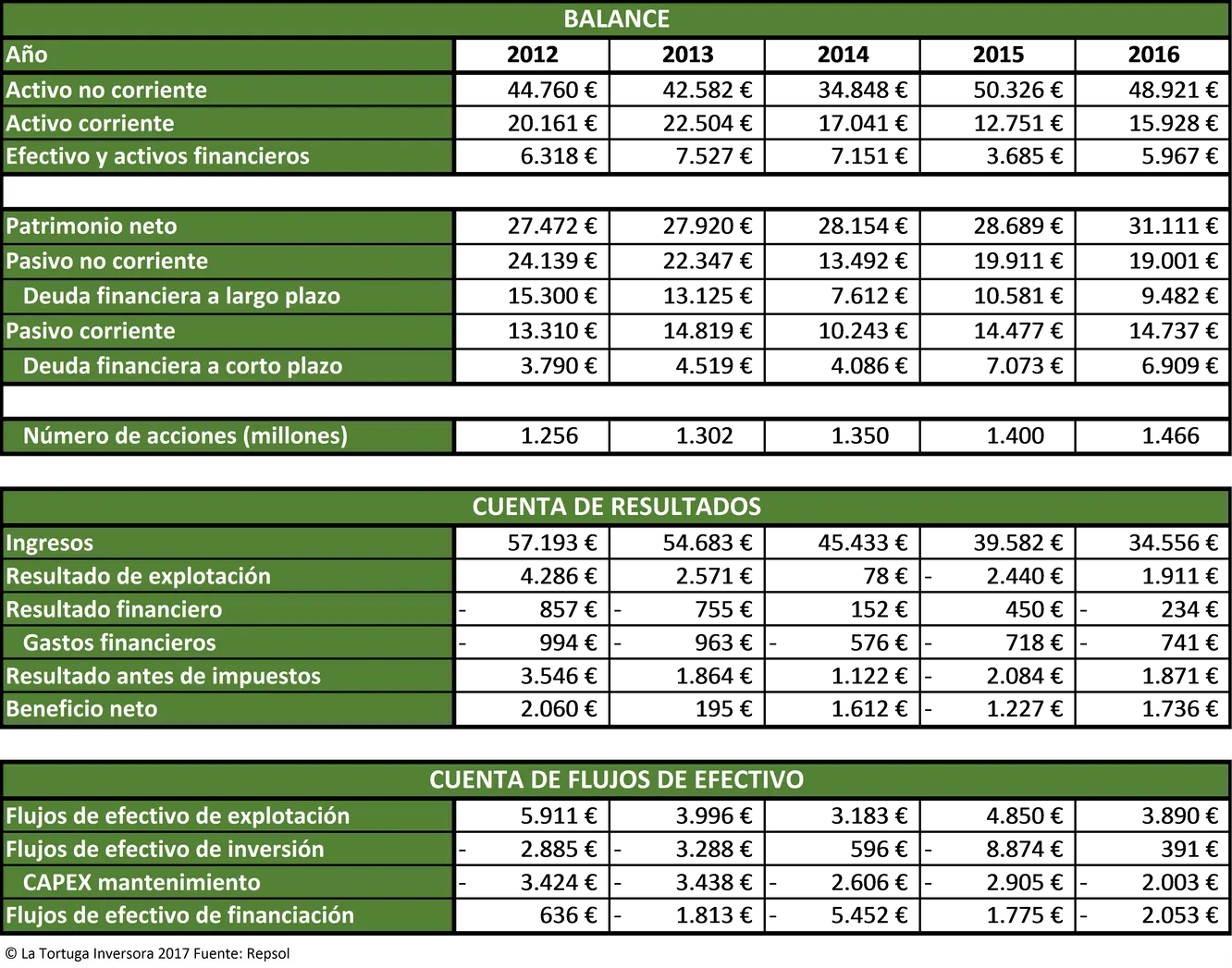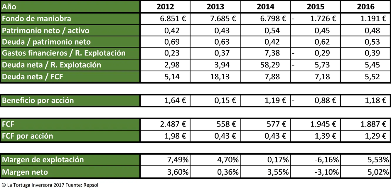 Durante el último quinquenio, la compañía ha logrado generar efectivo con sus actividades, es decir, el negocio petrolero da dinero. Además, la empresa siempre ha generado flujos libres de caja. Debemos destacar que la empresa sitúa los “pagos de intereses” en los flujos de efectivo de las actividades de financiación. Este hecho contable no es de mi agrado, ya que “maquilla” la generación de flujos de explotación, que evidentemente, serán menores. En 2016, el FCF ha sido de 1.887 millones de euros. No obstante, si situamos adecuadamente los “pagos de intereses”, el FCF descendería hasta los 1.296 millones de euros. Con este dato, la empresa tardaría ocho años en devolver toda la deuda; una cifra aún más abultada.