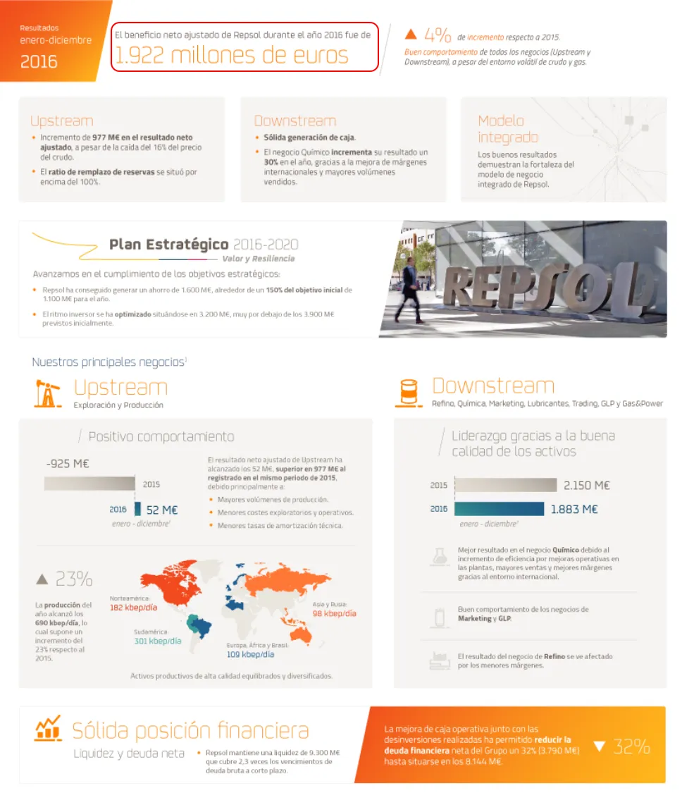 Nota: Los informes de Repsol dan mucha importancia al beneficio neto ajustado y dejan en un segundo plano el beneficio neto. En la infografría, la petrolera no informa en ningún momento del beneficio neto, solo destaca el beneficio neto ajustado.