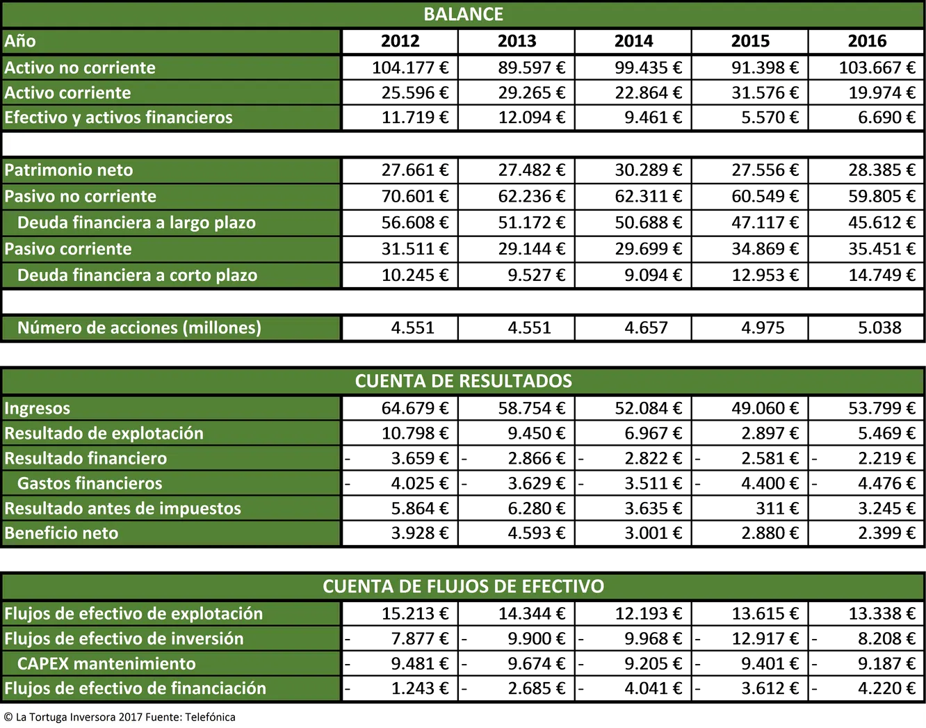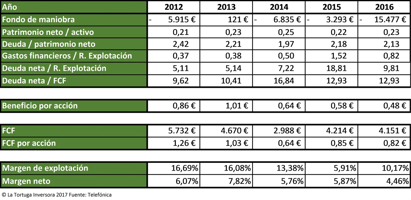Telefónica tiene una deuda financiera neta (deuda financiera – efectivo y activos financieros corrientes) de 53.671 millones de euros. Con los flujos libres de caja de 2016, la teleoperadora tardaría casi 13 años en pagar toda la deuda. Las cuentas son peores si se tiene en cuenta el dividendo, ya que la empresa tardaría la friolera cifra de 43 años en amortizar completamente su deuda. ¿Recomendarían ustedes suspender completamente el dividendo a los administradores de Telefónica? Yo desde luego sí.