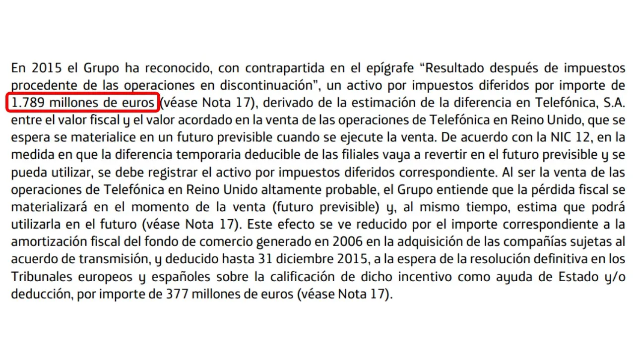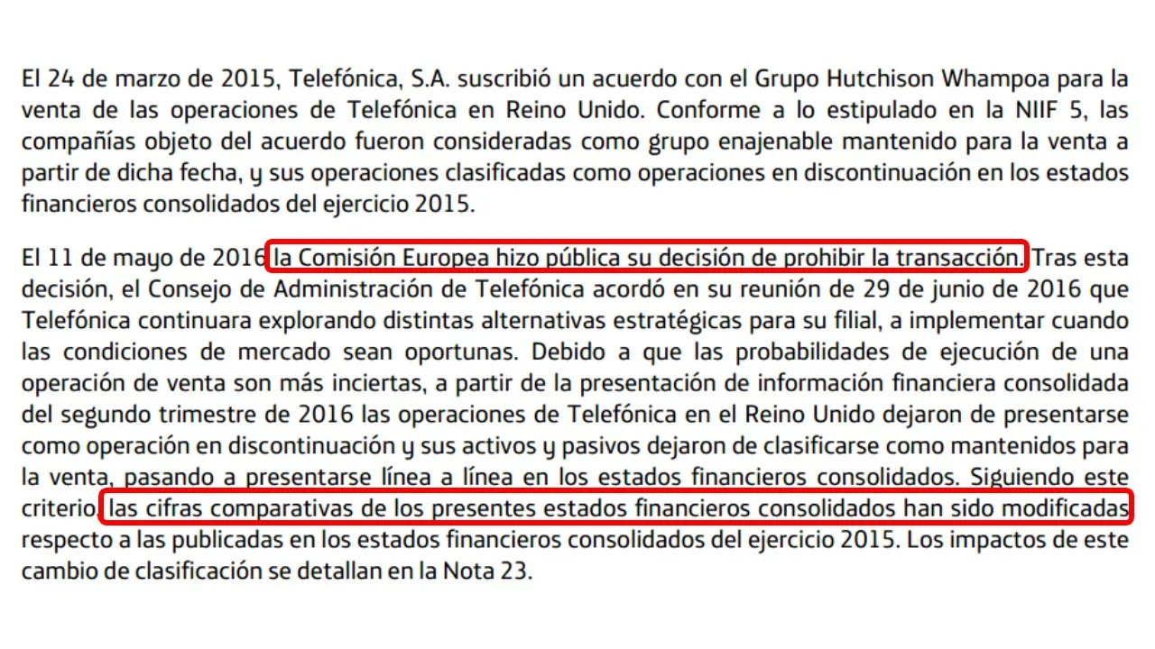 En 2016, Telefónica obtuvo un beneficio neto de 2.399 millones de euros . Aunque en un primer momento pueda parecer que el resultado ha empeorado, lo cierto es que ha mejorado . En 2015, la empresa registró un beneficio neto de 2.880 millones de euros, pero solo 298 millones correspondían a operaciones continuadas. El resto del beneficio provenía principalmente de la previsible venta de la filial en Reino Unido. No obstante, al final la operación no se ha realizado debido a la prohibición de la Comisión Europea.