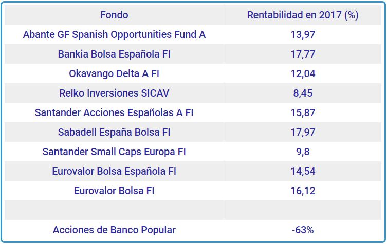 Es decir, para quienes no sean expertos en el tema, o si contamos con poca información, la diferencia entre haber errado el tiro invirtiendo en Popular o haber comprado un fondo que la tenga en cartera es abismal: es la diferencia entre tener minusvalías o plusvalías.