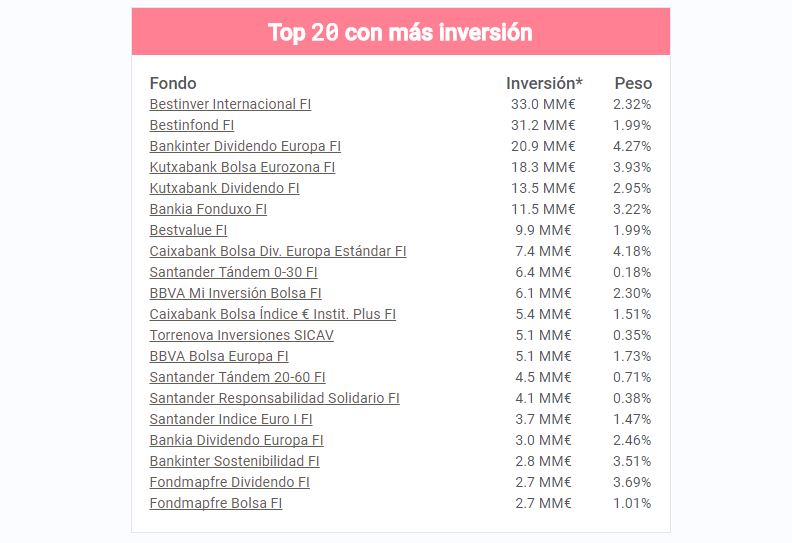 ¿Qué fondos españoles tienen a Intesa en cartera? Según los últimos datos públicos, Bestinver contaba con posiciones en su cartera internacional (Bestinver Internacional, Bestinfond), y pesa más de un 3% en la cartera de fondos como Bankinter Dividendo Europa, Kutxabank Bolsa Eurozona, Bankia Fonduxo, Caixabank Bolsa Div. Europea Estándar, Bankinter Sostenibilidad y Fondmapfre Dividendo.