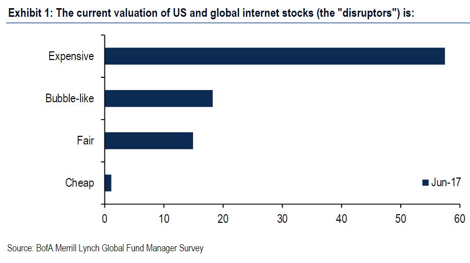Los gestores de fondos empiezan a desconfiar de los 'disruptores', las acciones de compañías tecnológicas relacionadas con Internet. Según la última encuesta de Bank of America Merrill Lynch, más de la mitad considera que este tipo de compañías están caras en bolsa (un 57%) y un 18% considera que incluso están en niveles de burbuja.