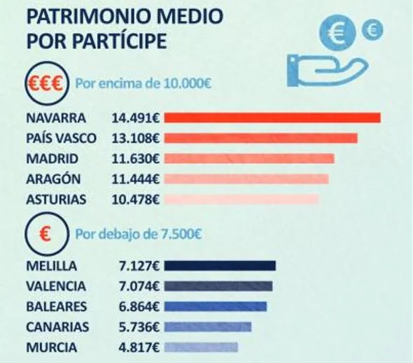Por comunidades, Navarra, País Vasco, Madrid, Aragón y Asturias es donde el ahorro medio de cara a la jubilación es mayor, oscilando entre los 10.000 euros y 14.500 euros por partícipe. En la otra cara de la moneda, los habitantes de Murcia, Canarias, Baleares, Valencia o Melilla tienen un colchón menor de cara a complementar la futura pensión pública. Su ahorro medio se sitúa entre 4.000 y poco más de 7.000 euros.