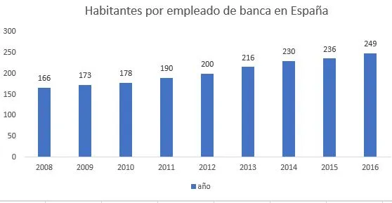 "La eficiencia, el mejor servicio a un precio adecuado, es lo que deben seguir persiguiendo nuestros bancos. La digitalización sin duda supone un reto, pero también una oportunidad para lograrlo", afirma el portavoz de la Asociación Española de Banca, José Luis Martínez Campuzano. Alude Campuzano al número de empleados de banca por habitante, cifra en la que España no sale tan mal parada en el ranking europeo: es decir, tenemos más sucursales pero menos plantilla respecto a la población que otros países. Si en 2008 había en España un empleado por cada 166 habitantes, la cifra ha subido hasta rozar los 250 a cierre de 2016, convirtiéndonos en el sexto país con menor proporción de trabajadores del sector bancario frente a la población.