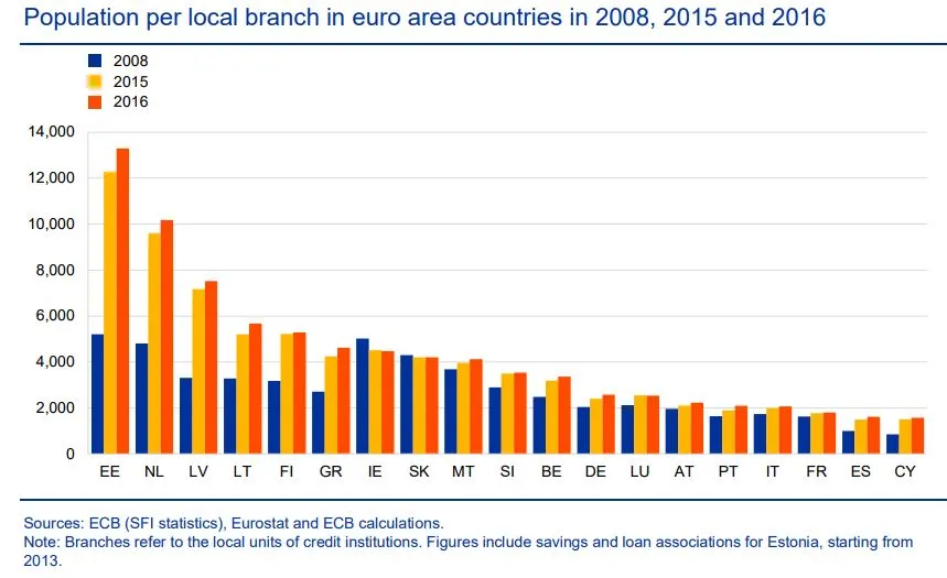 Pero esa proporción es todavía muy superior a la de Alemania (2.575 oficinas por habitante) o Bélgica (3.367), por no hablar de países del euro como Estonia y Países bajos donde la ratio supera los 10.000 habitantes por oficina.