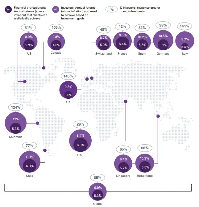 Fijáos en la diferencia entre la rentabilidad que los profesionales de cada país creen que sus clientes pueden conseguir y la que los inversores dicen necesitar. En todos los países señalados en el mapa los inversores responden con cifras mucho más elevadas que las que consideran sus asesores/gestores.