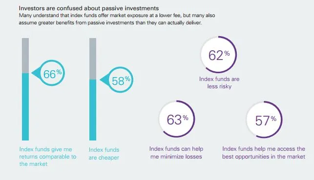 A nivel mundial, varios inversores parecen confundidos en torno al auge de la gestión pasiva o indexada. Más de la mitad cree que estos productos son más baratos (pero eso quiere decir que existe un 42% que no lo cree). Además, el 62% dice que los índices indexados tienen menos riesgo y también más de la mitad de los encuestados cree que pueden ayudar a minimizar las pérdidas.