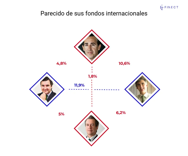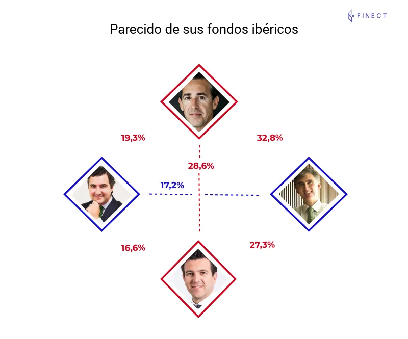 Los fondos que más tienen en común continúan siendo Cobas Iberia y AzValor Iberia, al coincidir en un tercio de su cartera. Tras ellos, AzValor Iberia y Bestinver Bolsa tienen en torno a un 28,6% en común y los fondos con más diferencias entre sí son Bestinver Bolsa y Magallanes Iberian Equity. (Aquí puedes ver las apuestas que más se repiten, en general, en la cartera de estos cuatro gestores en España y Portugal.