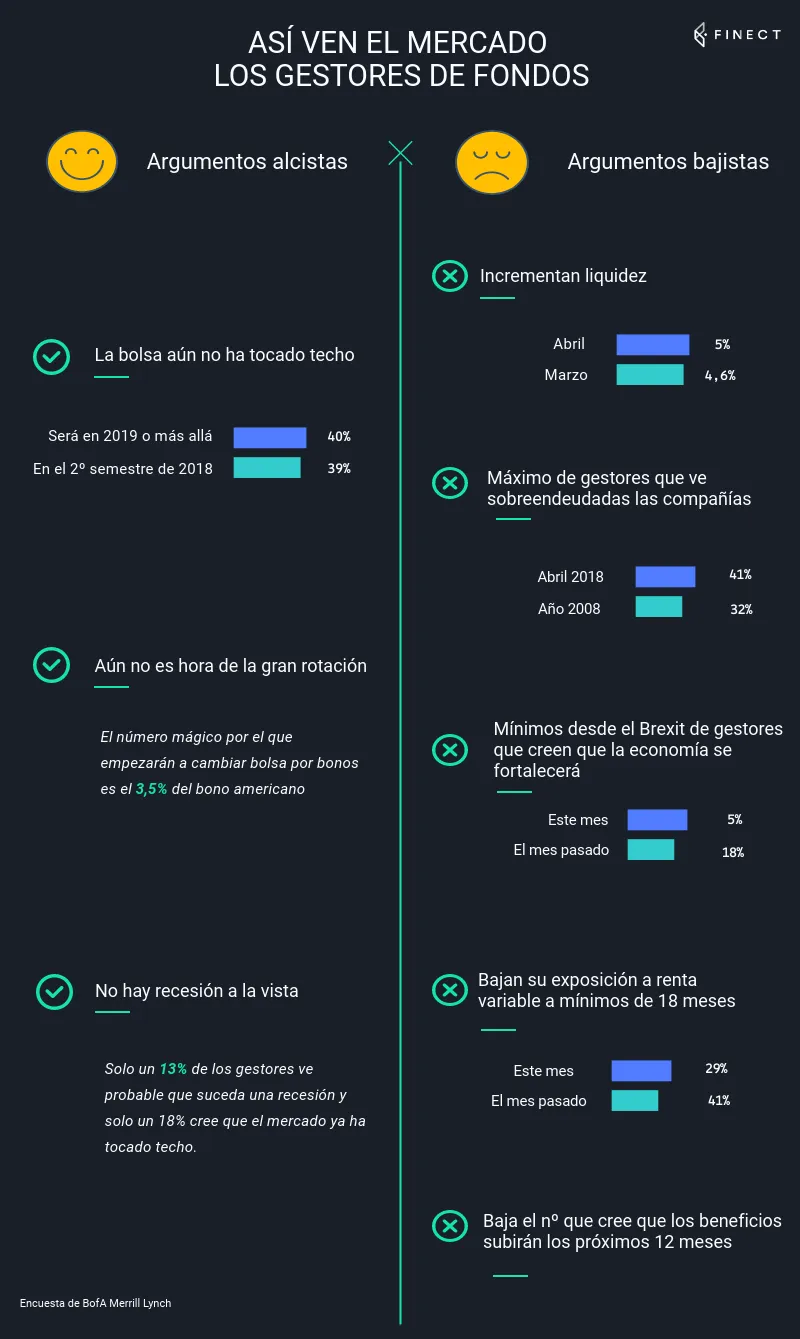 Con todo, en esta última encuesta de gestores, hay más puntos negativos que positivos. En esta infografía podéis ver un resumen de los argumentos alcistas y bajistas que se desprenden de las respuestas de los gestores.