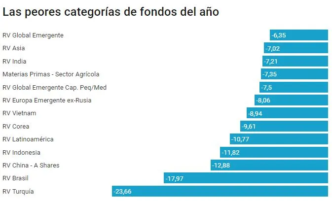 Eso deja a algunas de las categorías de fondos emergentes a la cola de la rentabilidad este año. De hecho, Turquía, Brasil, Indonesia o la renta variable latinoamericana encabezan las pérdidas (ver gráfico).