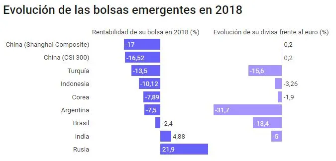 En este caso, para un inversor europeo, el descenso de algunas de las monedas emergentes contra el euro está agudizando las pérdidas. Por ejemplo, al 13,5% que cae la bolsa turca en 2018, el inversor del Viejo Continente debe sumar el 15% que se deprecia su divisa contra el euro.