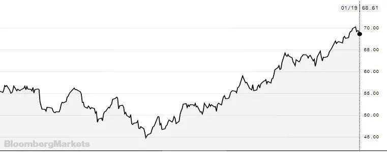 Esta es la cotización del barril de referencia en Europa (Brent). Ha subido más de un 50% en los últimos 7 meses.