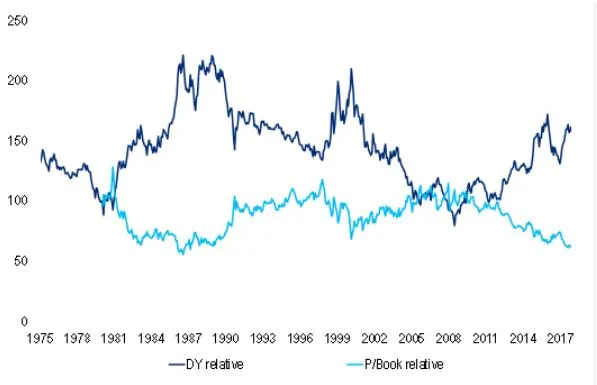 Como se puede ver en este gráfico, según el banco de inversión, el precio/valor en libros del sector de las grandes petroleras integradas, está en mínimos de 30 años en relación al resto del mercado. Fruto del castigo en bolsa, la rentabilidad por dividendo relativa está incrementándose: