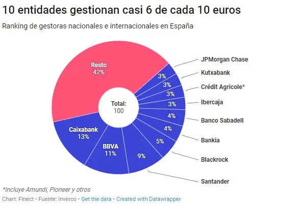 Si miramos el ranking de las 10 primeras, éstas gestionan casi 6 de cada 10 euros en España, entre las que se encuentran, por orden: Caixabank, BBVA, Santander, BlackRock, Bankia, Sabadell, Ibercaja, Crédit Agricole (Amundi, Piooner), Kutxabank y JPMorgan Chase.