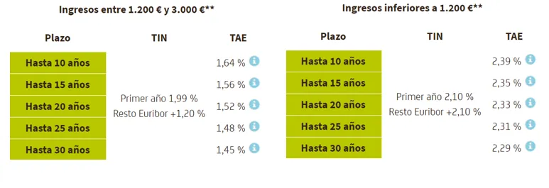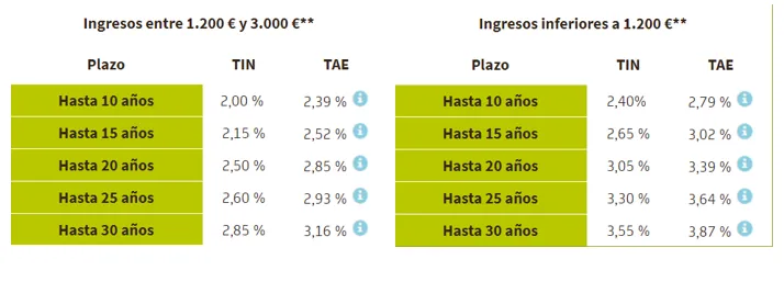 Bankia desglosa en su web el interés que tendrá tu futura hipoteca según tu nivel de ingresos. Para simular tu cuota mensual con la calculadora de Finect, lo único que tendrás que hacer es buscar en las siguientes tablas el rango de salario que se ajusta más a tu caso concreto.