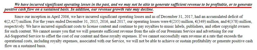 Spotify perdió 1.235 millones de dólares en 2017, pese a ingresar más de 4.000. Y en el documento que ha enviado a la CNMV americana (SEC, por sus siglas en inglés), el servicio de música advierte de que ha "incurrido en pérdidas significativas en el pasado y puede que no seamos capaces de generar suficientes ingresos para ser rentables o generar cash flow positivo de manera sostenible. Además, nuestra tasa de crecimiento de ingresos puede caer".