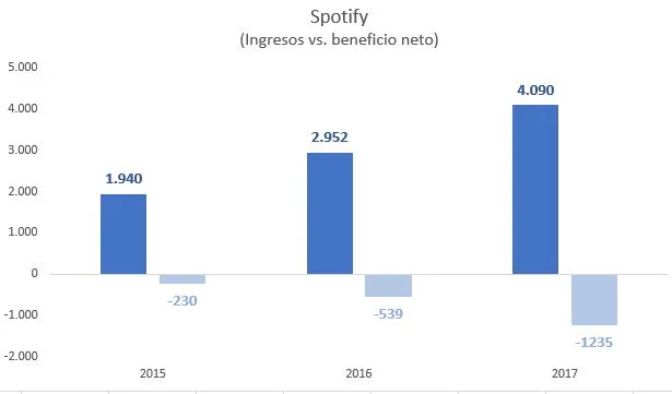 Los ingresos de la compañía han crecido significativamente en los últimos años, pero en lugar de que eso ayude a reducir las pérdidas, éstas, también se han ido acrecentando. Es decir, en dos años Spotify logró duplicar sus ingresos, pero también multiplicó las pérdidas por cinco, hasta 1.200 millones de dólares.