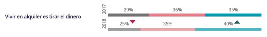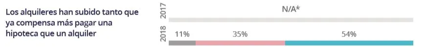 Si en 2017 el 29% de los jóvenes de entre 18 y 24 años buscaba o alquilaba vivienda, en 2018 son la mitad. De hecho, más de la mitad de los españoles considera que en estos momentos compensa más pagar un hipoteca que un alquiler, sobre todo en la franja de los 25 a los 34 años, donde lo cree un 59%. Además, según el estudio, solo un 11% de los españoles están en contra de esta idea.