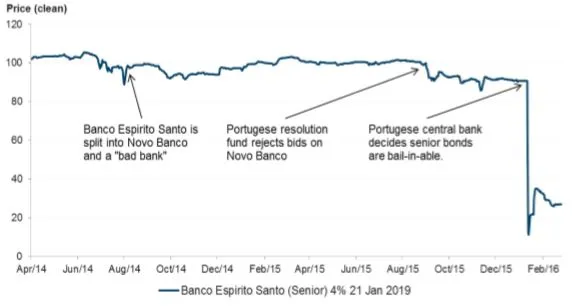 2) El caso del Banco Espirito Santo, donde los tenedores de deuda senior tuvieron que asumir fuertes pérdidas cuando el banco central de Portugal decidió utilizar estos instrumentos para el rescate. Los bonos garantizados, sin embargo, fueron excluidos de ese evento.