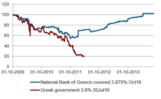 1) El caso de Grecia, en el que los tenedores de bonos soberanos tuvieron que afrontar el proceso de reestructuración de deuda, mientras los tenedores de bonos garantizados del Bational Bank of Greece mantuvieron su inversión y vieron cómo se recuperaba con el paso del tiempo.