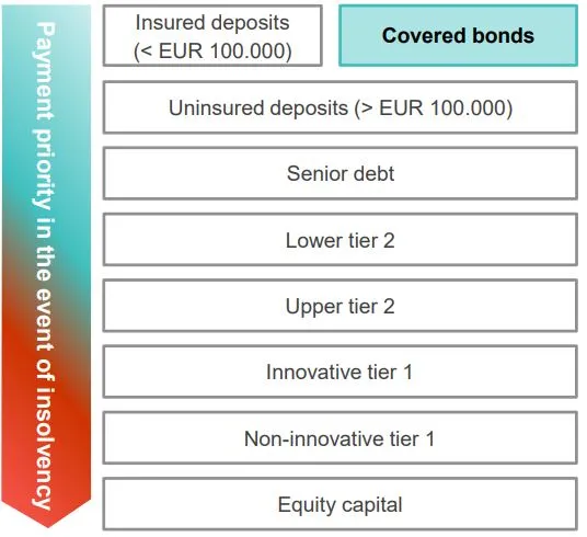 “Es la clase de activo más segura”, apunta Henrik Stille, gestor de Nordea, en un desayuno organizado por la gestora este martes. Ningún bono de este tipo ha sufrido un impago en los últimos 200 años. ¿La razón? Su situación privilegiada en la prelación de cobro en caso de insolvencia, que se puede ver en este gráfico: