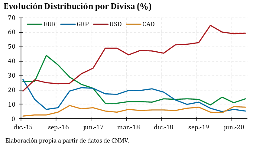 En cuanto a la distribución por divisa, el dólar estadounidense ha ido ganado importancia desde el lanzamiento del fondo en 2015. Así, ha pasado del 20% a finales de 2015 hasta cerca del 60% actual. En estos cinco años, azValor no ha cubierto la exposición a divisas diferentes al euro y, según su folleto, puede tener hasta un 100% de la inversión en divisas diferentes a esta.