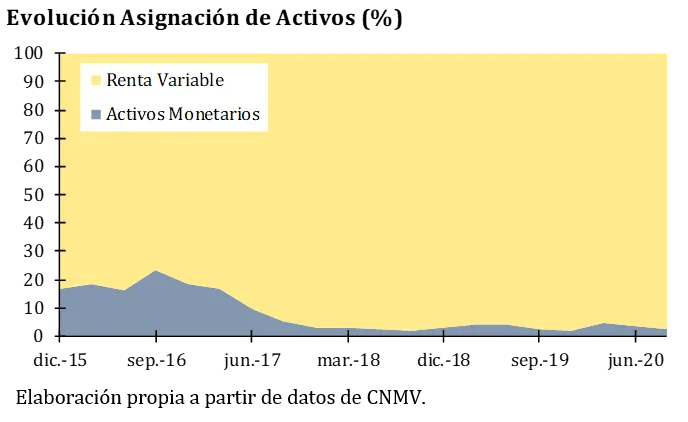 La inversión en renta variable se ha situado en niveles cercanos al 100%. De hecho, desde que se estabilizasen los activos gestionado por el fondo entorno a los 1.000 millones en la segunda mitad de 2017, la liquidez se ha situado por debajo del 5%.