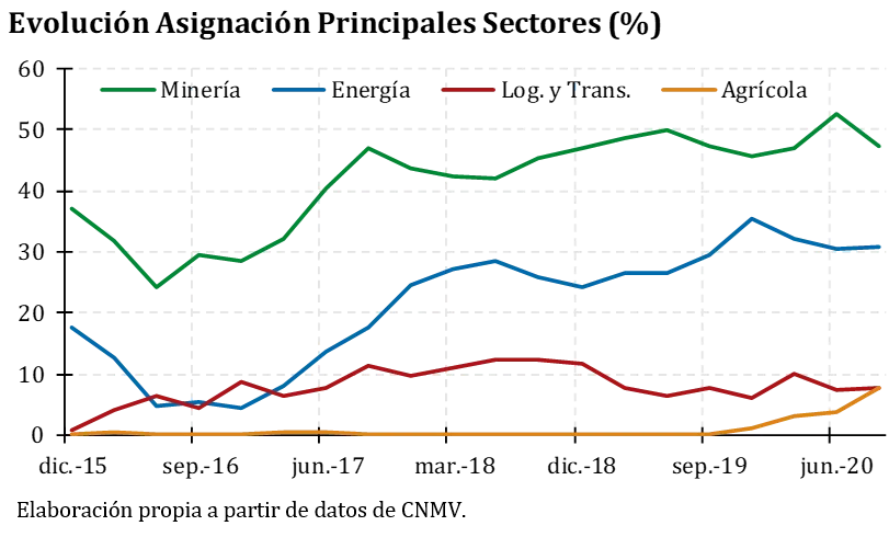 En lo que a la asignación sectorial se refiere los sectores que mayor importancia tienen actualmente en cartera son el de Minería (47,3% del total invertido en acciones) y Energía (30,7%), seguidos de compañías relacionadas con la Logística y el Trasporte (7,8%) y Agrícolas (7,6%).