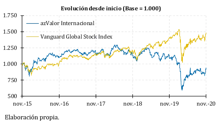 Desde su lanzamiento en 2015, azValor internacional se ha quedado muy rezagado respecto al índice de referencia, en este caso, el fondo de inversión indexado Vanguard Global Stock Index (clase investor en euros), que replica el índice de acciones global MSCI World. No obstante, desde azValor utilizan como índice de referencia uno exclusivamente europeo, el MSCI Europe TR.