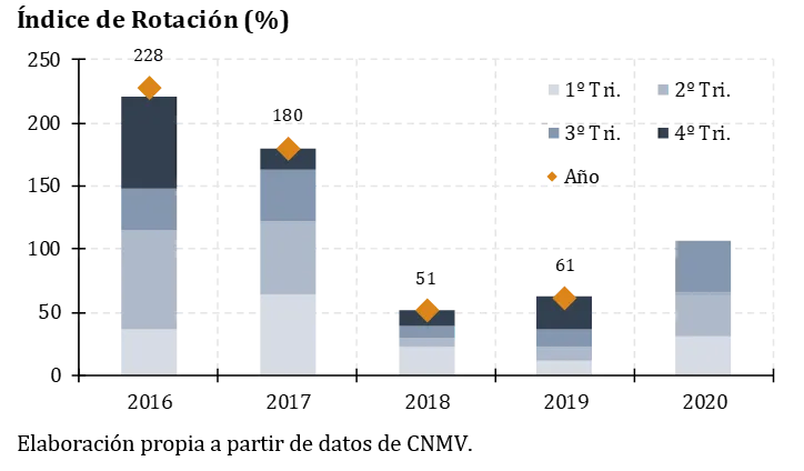 En consecuencia, en los 9 primeros meses de 2020 el índice de rotación es ya del 106%, es decir, los gestores han cambiado un volumen de activos equivalente a la totalidad de la cartera.