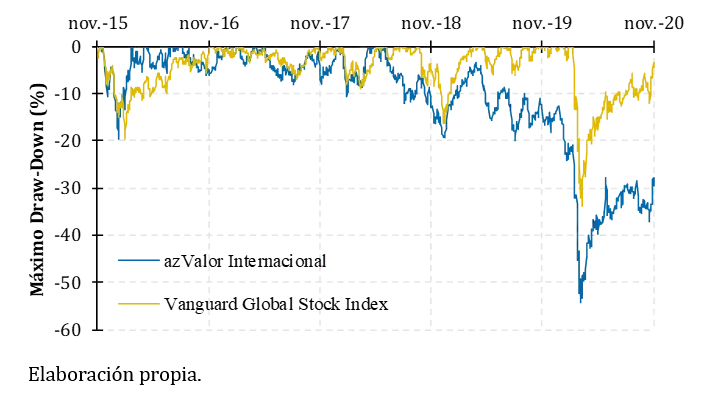 Por otro lado, la mayor caída sufrida por azValor Internacional desde su lanzamiento es del 54,18% frente al 33,76% del índice de referencia. En cualquier caso, del gráfico anterior cabe destacar que este mínimo se alcanzó tras más de 21 meses cayendo, mientras que en el caso del fondo indexado la caída ha coincidido con la pandemia provocada por la Covid-19.