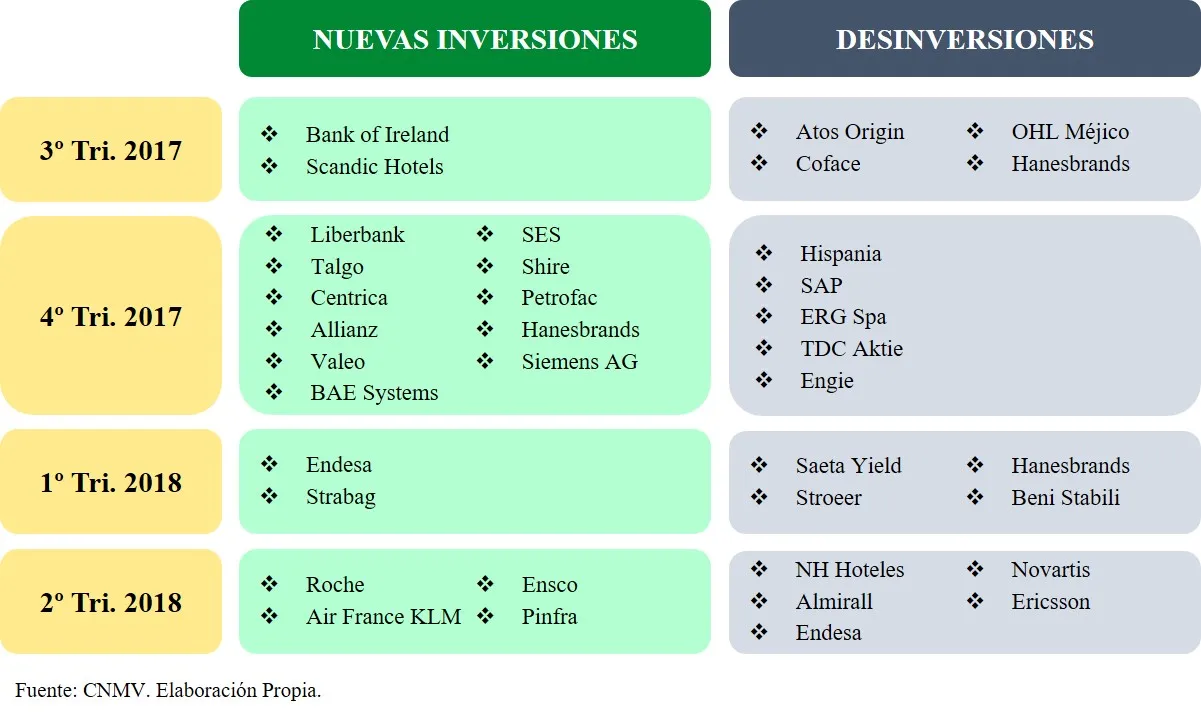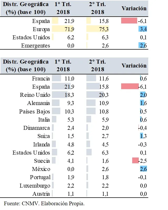 Asimismo, desde marzo de 2018 se ha incrementado la inversión en compañías de Méjico (debido a la ya comentada inversión en Pinfra), Reino Unido (como consecuencia de la inversión en Ensco) y Alemania. Por el contrario, se ha reducido la inversión en compañías españolas y suecas (debido a la desinversión en Ericsson).