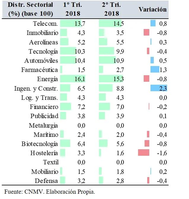 No obstante, la distribución sectorial se ha mantenido. El sector predominante continúa siendo el de Energía (15,3%) seguido de Telecomunicaciones (14,5%), Automóvil (10,9%) y Tecnología (9,9%). En la tabla inferior podéis observar la distribución sectorial completa.