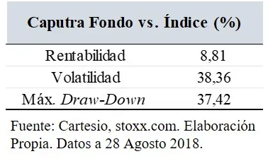 El fondo no ha conseguido superar la relación rentabilidad-riesgo de la bolsa europea en los casi ocho primeros meses del año, puesto que ha conseguido cerca de un 9% de la rentabilidad del índice con cerca del 40% de su volatilidad.