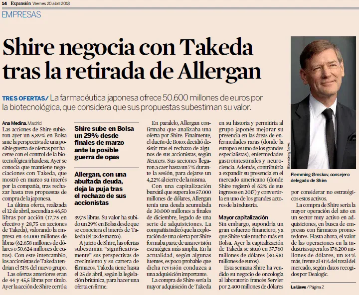 Shire, 4ª posición de Cobas Grandes Compañías, negocia con Takeda y sube un 29% desde finales de marzo