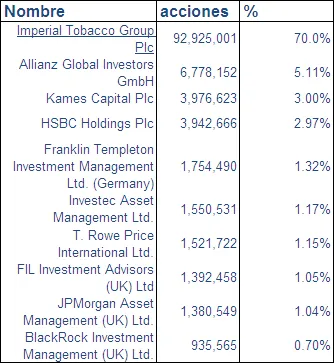 Vemos que el principal accionista es Imperial Tobacco Group (70%). Después nos encontramos una gran cantidad de fondos de inversión, con pequeñas participaciones que oscilan entre un 5% y un 0,7%.