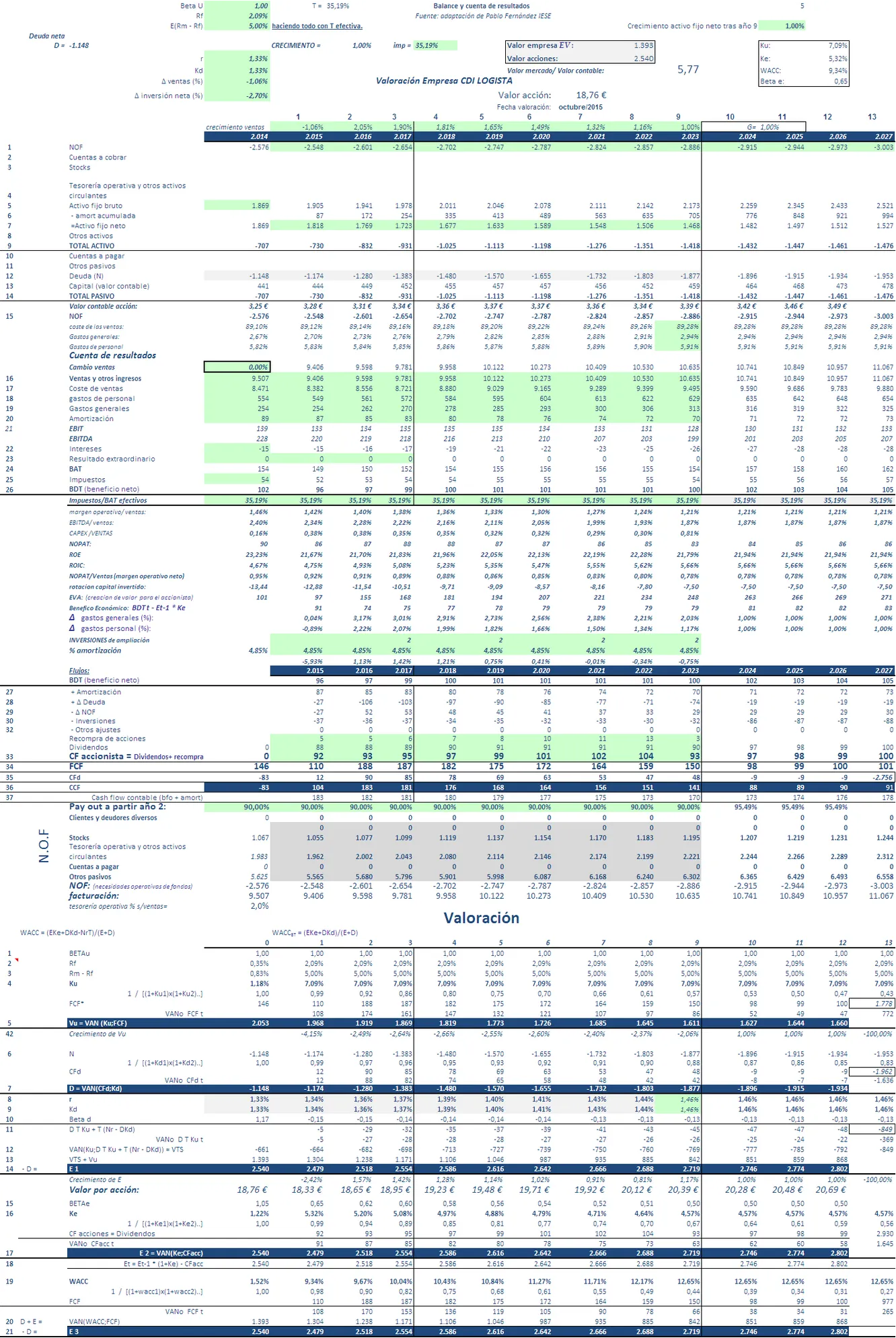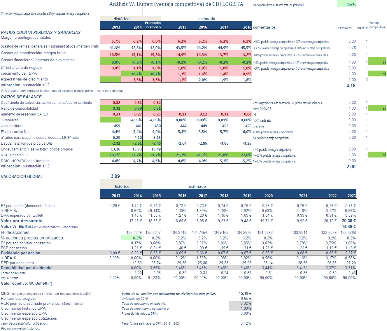 Esta empresa no me parece nada fácil de analizar. He seguido el procedimiento habitual descuento de flujos y comparación con múltiplos de Europas cotizadas. La impresión que tengo es que el mercado está valorando Logista por un precio muy similar al valor que obtendríamos por descuento de flujos. La comparación con múltiplos de cotizadas indicaría una ligera infravaloración. Tiene un PER razonable de 12.