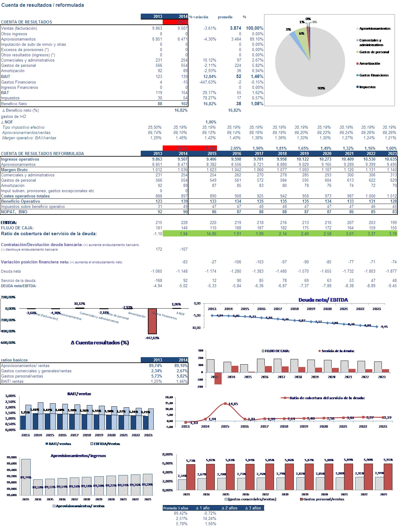 El margen operativo es muy ajustado (1,46%), lo que indica que estamos ante un negocio de márgenes muy estrechos y alta rotación. La rentabilidad sobre los activos fijos es reducida, en torno al 5%.