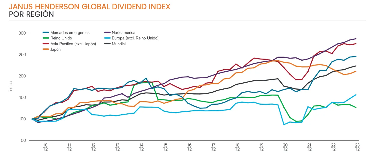 Invertir en dividendos es una de las opciones favoritas de muchos inversores. Y no les ha ido mal en el segundo trimestre del año, cuando el reparto de dividendos mundiales marcó un nuevo récord, según revela la última edición del Janus Henderson Global Dividend Index. En concreto, aumentaron el 4,9% interanual en tasa general hasta los 568.100 millones de dólares (cerca de 520.000 millones de euros): el 88% de las empresas aumentó sus distribuciones o las mantuvo estables en los tres meses analizados.
