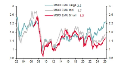 Moreau destaca también la notable diferencia de precios entre las grandes cotizadas europeas y estas pequeñas compañías. Mientras que el MSCI Eurozone (large caps) cotiza a 2,3 valor en libros, que corresponde a niveles de "su pico de 2006", el mercado de small caps se mantiene en el 1,5 veces, por debajo de su media histórica. "Aunque las small caps despertaron en 2025, la brecha de valoración con las grandes compañías sigue rozando sus máximos históricos", afirma el gestor.